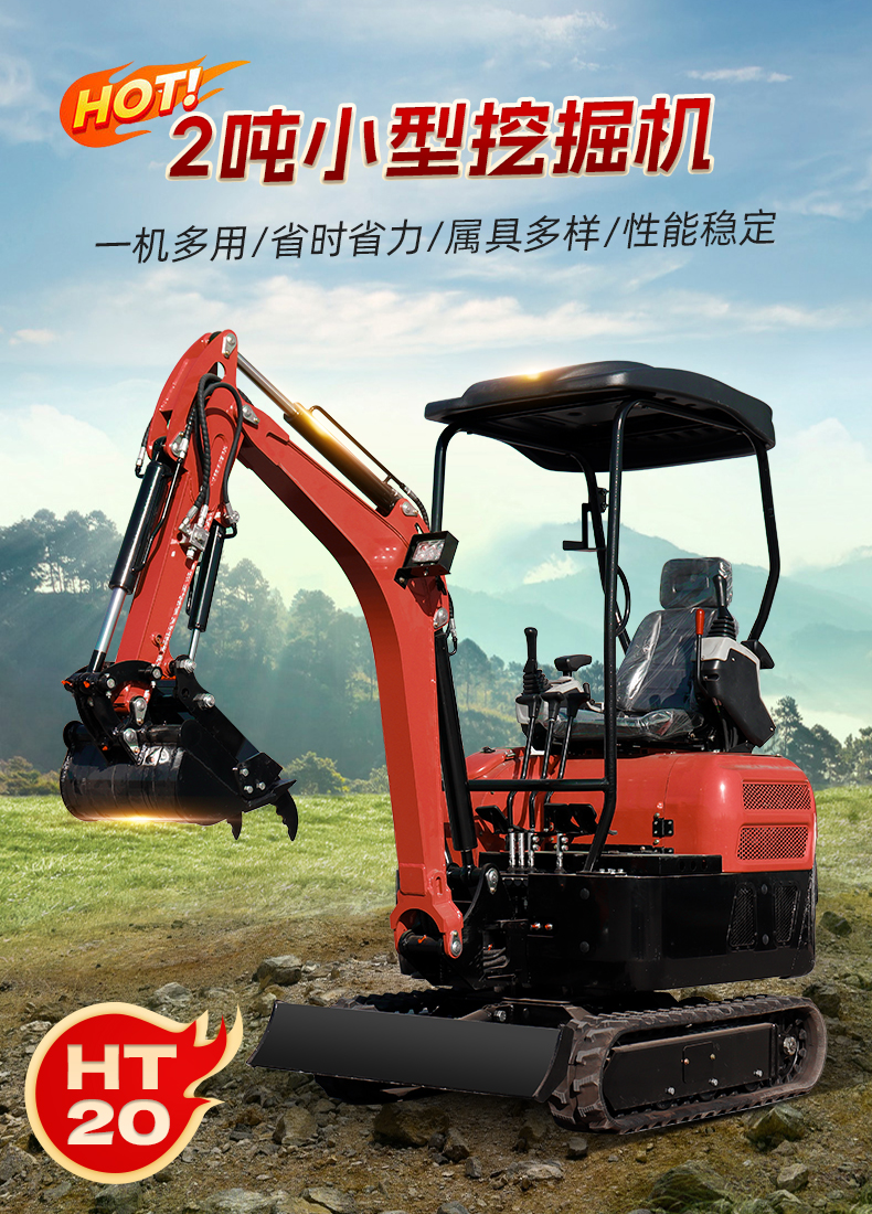 l 復雜工況(如山地開荒、破碎作業 ):對動力和屬具兼容性要求高。精拓 HT18 挖掘機,配備品牌發動機,動力強勁,支持 30 + 種屬具(如破碎錘、松土器 ),應對破碎、挖掘、抓舉等多場景作業;HT20 作為 2 噸級機型,大臂油缸倒立設計增加挖掘深度,屬具多樣,也適配復雜工況。