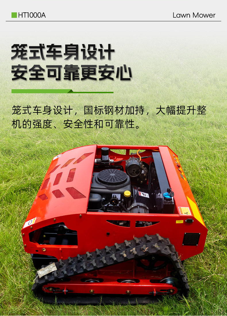 HT1000A遙控割草機籠式車身設計,國標鋼材加持,大幅提升整機的強度、安全性和可靠性。