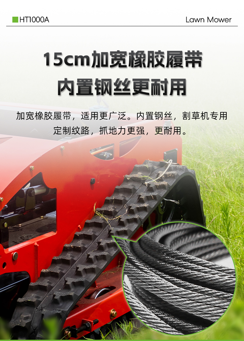 加寬橡膠履帶,適用更廣泛。內(nèi)置鋼絲,割草機專用定制紋路,抓地力更強,更耐用。